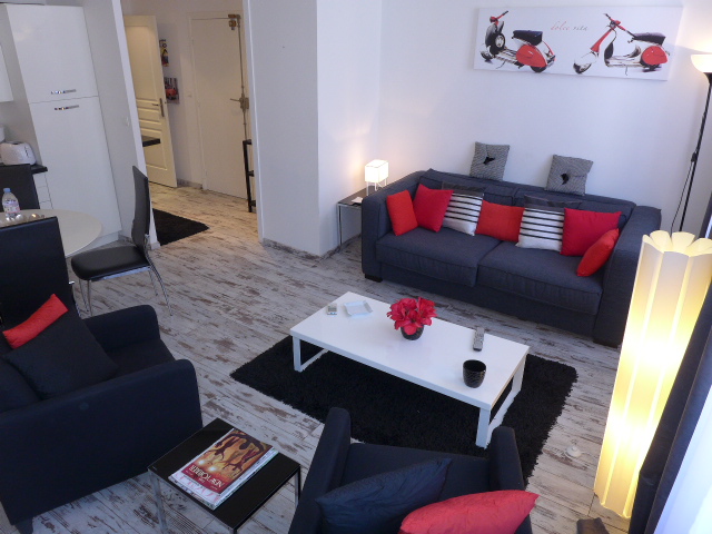 Nicely renovated 1 bedroom in the center of Cannes, 3 min from the Palais. Large, bright, modern, quiet. Living room with one sofa, large screen tv. Internet. Air conditioning. Very well equipped open kitchen. Bedroom with one double bed and en suite shower; One guest toilet.